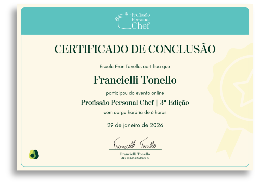 Sou Personal Chef e fundadora de uma das maiores escolas de Gastronomia Funcional do Brasil. Já formei centenas de alunos, que hoje atuam na área, e minha metodologia tem ajudado profissionais a transformarem sua paixão pela cozinha em uma carreira real e lucrativa.