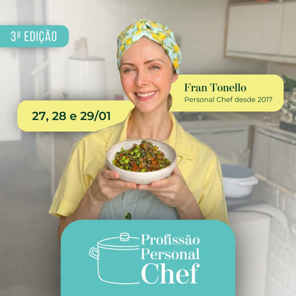 Nos dias 27, 28 e 29 de janeiro, você estará comigo, Fran Tonello, aprendendo como se tornar um Personal Chef e conquistar clientes de forma profissional.